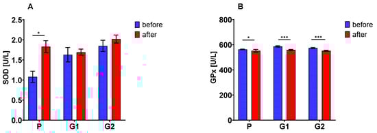 Blood superoxide dismutase (SOD) (A), glutathione peroxidase (GPx) (B) and reductase (GR) (C) activities; serum reduced (GSH) (D) and oxidized (GSSG) (E) glutathione and GSH to GSSG ratio (F). The asterisks (*, **, ***) denote a statistically significant difference after vs. before dietary intervention, set at p < 0.05; p < 0.01; p < 0.001, respectively.