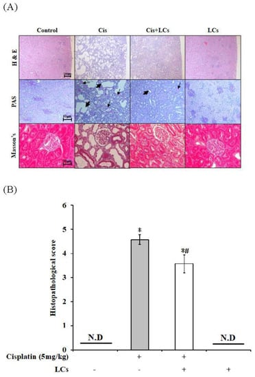 The ratio of kidney/body weight in the cisplatin group was significantly higher than that in the control group (p < 0.05), but it significantly decreased after supplementation with LCs. The ratio of liver/body weight in the Cis+LCs and LCs groups was significantly lower than that in the cisplatin group, whereas the ratio of stomach/body weight in the Cis+LCs group was significantly higher than that in the cisplatin group (Supplementary Table S1).