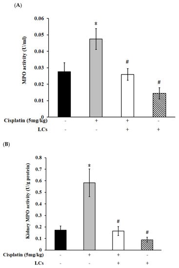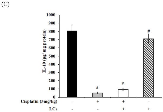 Effects of cisplatin and LCs supplementation on inflammation responses in kidney tissues. (A) Serum MPO. (B) Kidney MPO. (C) IL-10. Results are shown as mean ± SEM (n = 7 per group). * p < 0.05 compared with the control group; # p < 0.05 compared with the cisplatin group.