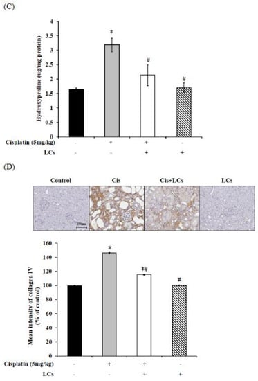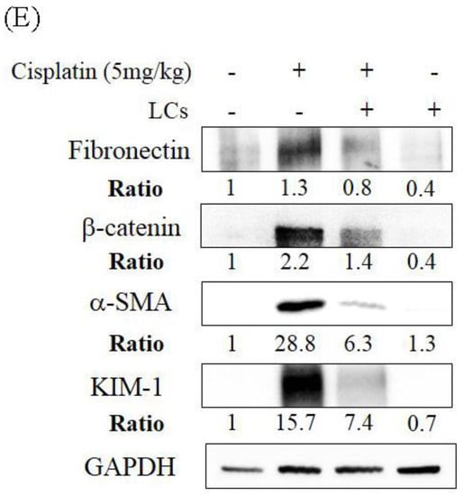 We further evaluated some molecular and histological markers of fibrosis to understand the antifibrotic effects of LCs in tubule injury. Hydroxyproline may be a potential marker of nephrotoxicity related to fibrosis following dosing with cisplatin [32]. We also found that the high values of kidney hydroxyproline in rats treated with cisplatin were consistent with the occurrence of fibrosis and renal tubule necrosis noted in the histopathological results (Figure 3C). Meanwhile, quantification of collagen IV-area fraction showed higher expression values of collagen IV-positive cells in cisplatin treatment groups compared with the control group (Figure 3D). Further analysis using Western blot demonstrated significantly higher expression of fibronectin, β-catenin, and α-SMA protein in the kidney of the cisplatin treatment group compared with the control group. Meanwhile, an improved histological fibrosis was exhibited in the LCs supplementation group, which had a low level of inflammation cell infiltration, collagen IV-positive cells, and expression of fibronectin, β-catenin, and α-SMA protein in kidney tissues as compared with the cisplatin group (Figure 3E). Therefore, LCs administration could reduce cisplatin-induced fibrosis.