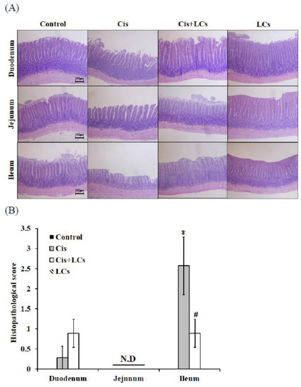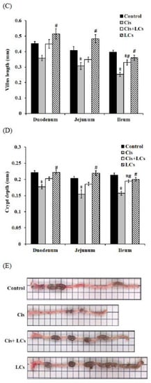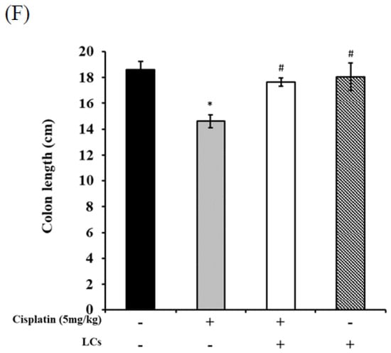 Intestinal tissues (duodenum, jejunum, and ileum) were examined for histopathology by H&E to observe whether LCs have protective effects against cisplatin-induced mucositis. The normal histology of the small intestine in the control group was characterized by villi which were finger-like and intact, with intact crypt architecture, regular epithelial cells, and mucosal integrity. By contrast, cisplatin caused significant histological changes in ileum segments, and this damage involved shortened villi, loss of crypt architecture, and a pronounced inflammatory cell infiltrate in the lamina propria (Figure 4A–D). Apparently, the H&E-stained section of the ileum from the LCs-pretreated group showed prominent improvement as compared with the cisplatin-treated rats. Research has shown that the length of the colon decreased with inflammation. Hence, colon length could be used as an indicator of inflammation [21]. As shown in Figure 4E,F, the length of the colon in the cisplatin group was significantly shorter than that in the control group, whereas the LCs-pretreated group significantly prevented the decrease in the colon length as compared with the cisplatin group (p < 0.05). In addition, no significant differences in colon length were observed between the LCs alone group and control group.