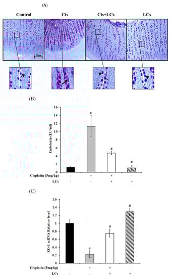Goblet cells are the first line of defense of the mucosal surface, and they secrete mucins that form a protective gel-like covering in the gastrointestinal lumen. Therefore, mucins serve as a protective layer. The loss of the mucus layer caused by inflammation triggers the release of goblet cell mucus. LPS could cause endotoxemia, which results in systemic inflammation, depletion of mucous granules from goblet cells, and decreases the intracellular storage of goblet cell mucins in the mucosal villi epithelium [53]. We speculate that cisplatin can cause the disintegration of goblet cells, which is associated with LPS production. LCs pretreatment showed protection against cisplatin-induced goblet cell disintegration, thereby preserving goblet cell mucins in the mucosal villi epithelium.