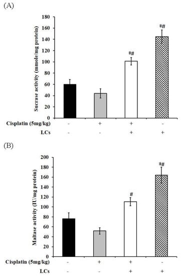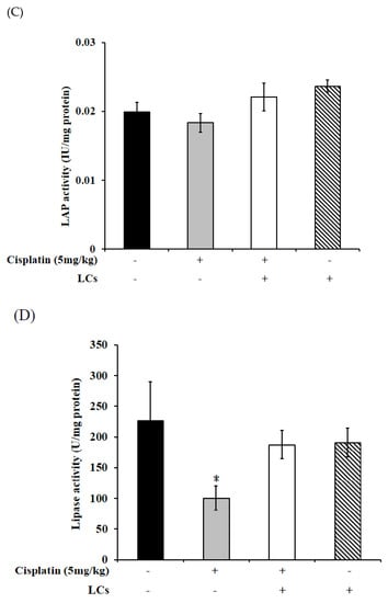 The mucosal integrity was impaired, and the activities of intestinal digestive enzymes in the BBM (such as sucrase, maltase, leucine amino enzyme, and lipase) significantly decreased in rats treated with cisplatin, which led to a significant reduction in intestinal function [33]. The activity of the intestinal digestive enzymes was measured to evaluate digestive function. We observed that cisplatin l reduced lipase activity compared with the control group (Figure 6D), whereas supplementation of LCs in cisplatin-treated rats significantly improved the activities of sucrase and maltase as compared with cisplatin-treated rats (p < 0.05; Figure 6A,B). On the contrary, the activities of sucrase and maltase were markedly increased in rats fed with LCs as compared with the normal rats. However, LAP digestive enzyme activity did not show any significant difference among the four groups (Figure 6C).