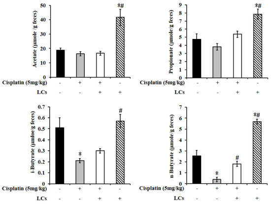 We further investigated whether LCs’s protection could involve modulation of the SCFAs. In fecal samples, the levels of n-butyrate significantly declined in cisplatin-treated rats compared with the control group, and such levels were restored by LCs supplementation. In addition, among the four groups, the levels of acetate, propionate, and n-butyrate were highest in the LCs alone treatment group (Figure 7).