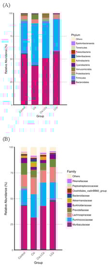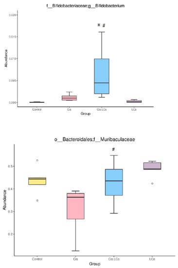 Our study found that LCs can change the composition of the gut microbiome and shift the gut microbial community toward certain beneficial bacteria, including Bifidobacterium and Oscillibacter. CBM 588 was used in our study and increased Bifidobacterium abundance, carbohydrate metabolite production, and SCFA production in an antibiotic-induced colitis model, thereby improving colon epithelial damages [21]. Bifidobacterium and Bacteroidales family S24-7 belong to potential fiber-degrading bacteria, which could efficiently ferment fiber into butyrate [61]. The abundance of Bifidobacterium is correlated with the mucus growth rate [61]. Bifidobacteria could reduce serum levels of IS through modulating the intestinal microflora in hemodialysis patients [62]. In addition, an increase in the relative abundances of Bifidobacterium in the GI tract reduces intestinal endotoxin production and maintains barrier function [63]. Notably, in the current study, Muribaculaceae was enriched within the gastrointestinal tracts of rats receiving cisplatin plus LCs as compared with cisplatin-treated rats and was dominant in rats treated with LCs alone (Figure 8G,H). Muribaculaceae, also called S24-7, is involved in complex carbohydrate degradation, and it plays an immunomodulatory role [64]. Muribaculaceae is a butyrate-producing bacterium which is positively correlated with immune responses, including natural killer cell and NF-κB signaling [65].