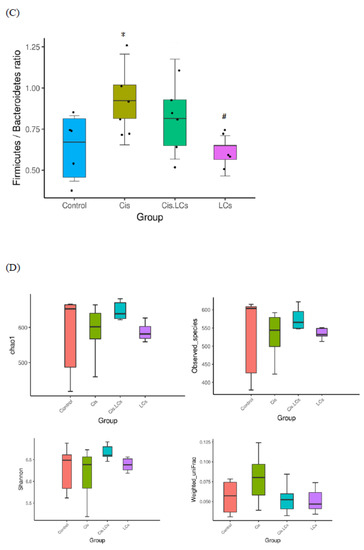 Evidence shows that cisplatin can cause a severe compositional and functional disturbance in the gut microbial community [1,2]. Next, NGS-16S analysis in feces of cecum was performed to investigate whether the reconstruction of gut microbiota induced by “good” bacteria could prevent kidney damage after cisplatin administration. At the phylum level (Figure 8A), compared with the control group, a lower abundance of Bacteroidetes and a higher abundance of Firmicutes were observed in cisplatin-treated rats, which resulted in an increased Firmicutes/Bacteroidetes (F/B) ratio in the cisplatin treatment group (Figure 8C). However, the cisplatin and LCs combined therapy did not significantly affect the F/B ratio. The richness, diversity, and evenness of gut microbiota were expressed by Chao1 and Shannon indices among the four groups (Figure 8D). The values of Chao1 and Shannon in the cisplatin group were lower than those of the control group, whereas higher values in alpha diversity indices were observed in the Cis+LCs group, compared with the cisplatin group. The Chao1 and Shannon indices were lowest in the LCs alone treatment group. These findings suggested that LCs intervention could reverse the ecological diversity and richness of gut microbiota in cisplatin-treated rats. Weighted UniFrac distance approach was used to compare the similarity of the gut microbial communities (β diversity) and the global composition of the microbiota among the groups. Figure 8C also shows the average weighted UniFrac distances. The smaller the value, the smaller the difference in species diversity among the samples.