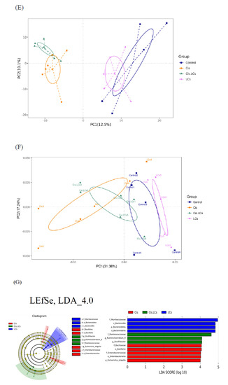 The PCoA plots showed that the closer the distance among the samples, the more similar the species composition structure; therefore, these microbiota will cluster together. As shown in Figure 8F, PCoA plots revealed that the rats fed with LCs alone had a similar gut bacterial composition with small intra-group variation, but the rats treated with cisplatin and co-treated with LCs exhibited greater intra-group variations.
