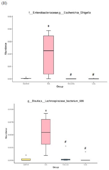 We used metagenomeSeq to identify taxa that showed statistically significant genera or species levels at different treatment groups (Figure 8H). Escherichia-Shigella and Lachnospiraceae bacterium 609 were highest within the gastrointestinal tract of rats treated with cisplatin compared with other treatment groups, and this increase was reversed by the supplementation of LCs. By contrast, we observed that cisplatin reduced the amount of Muribaculaceae and Roseburia compared with the control group, whereas supplementation of LCs in cisplatin-treated rats significantly increased both bacteria. Notably, the amounts of Bifidobacterium in the Cis+LCs group were highest among the four groups.