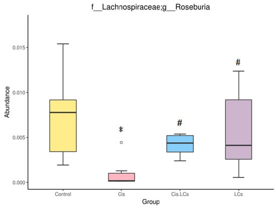 Our results also showed that oral supplementation of LCs increased the abundance of Oscillibacter (Figure 8G) and Roseburia (Figure 8H) after cisplatin treatment. A previous study showed that Oscillibacter abundance was increased in rats with a high-fat diet. The increased Oscillibacter abundance is associated with the metabolic syndrome and development of obesity-related metabolic disorders [57]. However, another clinical trial revealed that Oscillibacter and Lachnospiraceae were significantly reduced in patients with amyotrophic lateral sclerosis compared with the healthy controls [66]. Moreover, Oscillibacter was considered as a producer of anti-inflammatory metabolites, which could reduce Th17 polarization and promote the differentiation of anti-inflammatory Treg/Tr1 cells in the gut [3]. Therefore, the roles of Oscillibacter involved in the physiology of the host need further investigation. Roseburia spp. (butyrate-producing bacteria) belong to the Firmicutes phylum and exhibit anti-inflammatory effects on patients with ulcerative colitis [67]. In patients with CKD, impaired kidney function was positively correlated with the levels of Enterobacteriaceae and E. coli but negatively correlated with the levels of Bifidobacterium spp. and Roseburia spp. [68], indicating that the depletion of these two butyrate-producing bacteria may contribute to CKD-associated inflammation and CKD progression.