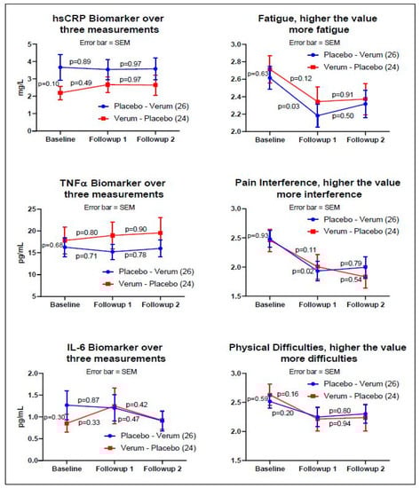 - When each time point was examined, improved subjective PROMIS® measures of fatigue and pain interference were observed between the baseline and first follow-up assessment for the placebo only by Fisher’s LSD adjustment (p < 0.03, pre-post paired F(2,75) = 2.51, two-tailed).