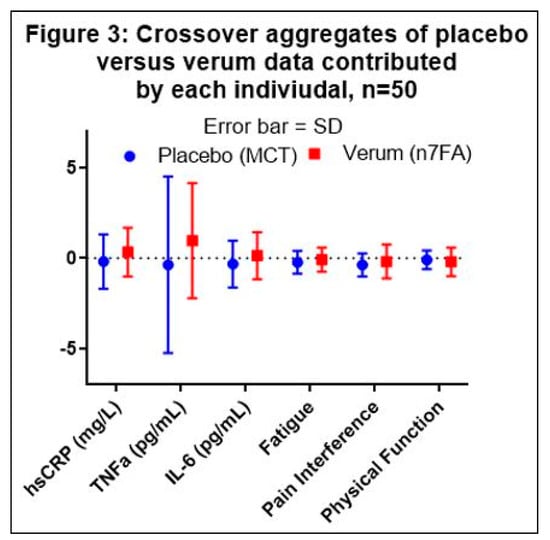 Sasagawa, M.; Boclair, M.J.; Amieux, P.S. Omega-7 Mixed Fatty Acid Supplementation Fails to Reduce Serum Inflammatory Biomarkers: A Placebo-Controlled, Double-Blind Randomized Crossover Trial. Nutrients 2021, 13, 2801. https://doi.org/10.3390/nu13082801