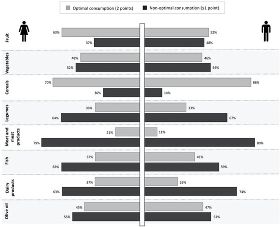 A cluster of overconsumptions was identified for animal-based food products such as meat and meat products as well as dairy products. Another cluster was composed of fruit, vegetables, legumes, fish, and olive oil, which showed the same pattern of suboptimal consumption.