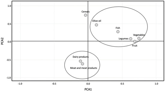 To understand the different patterns of consumption among the adolescents investigated, we conducted a PCA analysis of the Medi-Lite scores regarding the individual food components. As shown in Figure 2, the sample investigated was clustered into two main groups regarding the consumption of each specific food component of the score.