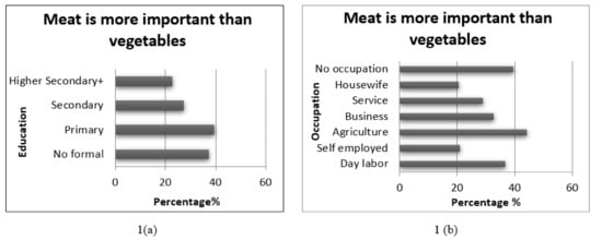 In order to analyse the underpinnings of responses to the statement ‘meat is more important than vegetables’, the distribution by educational attainment and occupation was examined. As Figure 1a illustrates, with some level of education, people were less likely to comply with popular, prejudiced beliefs regarding fruit and vegetable intake. Figure 1b further reveals that people who were unemployed or work in the agriculture sector were more likely to subscribe to the idea that ‘meat is more important than vegetables for health’.