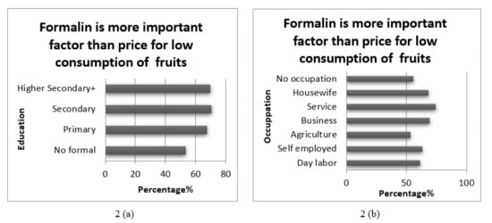 On the contrary, patterns in Figure 2a,b indicate that the more highly educated compared to ‘no formal education’ and those in the service sector compared to agriculture were more concerned about formalin on fruits and vegetables over price. Service holders were likely to have higher education background, higher income status, and easier and more access to resources (TV, radio, health worker) to know about food safety than a farmer or a day-labourer.