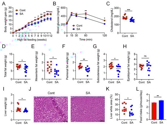 We first verified the inhibitory effect of SA on diet-induced MetS. Compared with controls, mice that were fed a HFD and treated with SA for 12 weeks exhibited reduced body weight gain and plasma cholesterol levels and improved glucose tolerance, as assessed by the OGTT (Figure 1A–C). In addition, the mesenteric, perirenal, subcutaneous, and total fat weights were significantly lower in the SA-treated group than in the controls (Figure 1D–G); however, there was no significant difference in the epididymal fat weight (Figure 1H). Liver weights were also lower in the SA-treated group than in the control group (Figure 1I). Furthermore, histological analysis revealed that the lipid droplet area in the liver was reduced after SA treatment (Figure 1J,K). Meanwhile, food intake was slightly increased in the SA-treated group than in controls (Figure 1L). Collectively, these results indicate that supplementing the diet with SA ameliorates HFD-induced MetS.