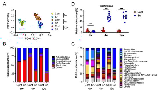 Dietary treatment with sodium alginate (SA) altered the gut microbiota composition of high fat diet (HFD)-fed mice. Mice were fed a HFD supplemented with or without 5% SA for 0, 4, or 12 weeks (n = 8–10 mice per group). (A) Principal component analysis (PCoA) of the microbiome in fecal samples was performed using unweighted UniFrac. (B,C) Relative abundance of amplicon sequence variants (ASVs). The different colors correspond to different bacterial phyla (B) and genera (C), as indicated. (D) Relative abundance of Bacteroides in the fecal samples. Each dot represents an individual mouse, and the horizontal bars indicate mean values. Statistical significance was assessed by Welch’s t-test (D). *** p < 0.001; n.s., not significant. Cont: HFD diet; SA: HFD diet with 5% sodium alginate.