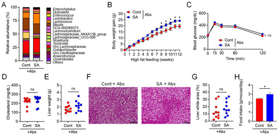 Subsequently, we examined whether the inhibitory effects of SA on MetS depended on the gut microbiota. Analysis of the 16S ribosomal RNA (rRNA) genes of the mouse fecal microbiota revealed that HFD intake altered the gut microbiota composition. Moreover, these HFD-dependent changes in the gut microbiota composition differed between the control and SA-treated groups 4 weeks as well as 12 weeks after HFD intake (Figure 2A–C). HFD intake increased the abundance of Firmicutes and Proteobacteria and decreased the abundance of Bacteroidetes. Supplementation of HFD-fed mice with SA dramatically increased the abundance of Bacteroidetes and prevented the increase in Firmicutes and Proteobacteria (Figure 2B). Furthermore, supplementation with SA increased the abundance of the Bacteroides genus (Figure 2C). These results suggest that SA alters the gut microbiota composition and may ameliorate the effect of SA on HFD-induced MetS. To investigate whether the gut microbiota is required for the suppressive effects of SA, mice were maintained on a HFD, supplemented with or without SA and treated with Abx to deplete the microbiota. Gut microbiota composition was comparable between the control and SA-treated groups, and Bacteroides were undetectable following treatment with erythromycin (Figure 3A). SA treatment did not suppress but instead promoted body weight gain in response to HFD (Figure 3B). In addition, SA did not improve glucose tolerance (Figure 3C) or reduce plasma cholesterol levels (Figure 3D), liver weight (Figure 3E), or the lipid droplet area in the liver (Figure 3F,G). Food intake was slightly increased in the SA-treated group than in controls (Figure 3H). These results demonstrate that the preventive effect of SA on HFD-induced MetS depends on the gut microbiota.