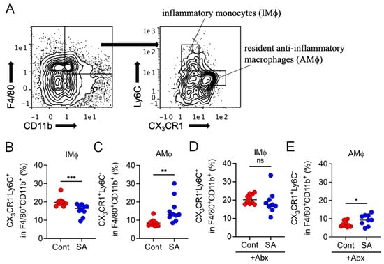 In addition to macrophages, we also monitored another population of immune cells in the intestine. The abundance of neutrophils (CD11b+Ly6G+Ly6C+, Figure S2A) and monocyte-derived dendritic cells (CD11c+CD11b+MHCII+Ly6C+, Figure S2B), which differentiate from Ly6C+ IMϕ [27], was significantly lower, while that of conventional dendritic cells (CD11c+CD11b+MHCII+Ly6C−, Figure S2C) [28] was higher in the colonic tissues from the SA-treated mice than those from the controls. The abundance of eosinophils (CD11b+F4/80+SiglecF+) was comparable between the colonic tissues from SA-treated mice and those from the controls (Figure S2D). These differences were not observed after Abx treatment (Figure S2E–G). No difference was observed in the population of CD4+ T cell subsets, namely, T helper type-1, -2, and -17 cells, and T-regulatory cells, between the control and SA-treated groups (Figure S3).