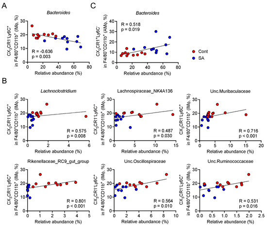 Bacteroides were negatively correlated with the abundance of inflammatory monocytes in the colon. Mice were fed a HFD supplemented with or without 5% sodium alginate (SA) for 4 weeks (n = 10 mice per group). Spearman’s rank correlation coefficient was used to analyze the correlation between the relative abundance of gut microbiota and the percentage of colonic macrophages. (A,B) Scatter plots showing the (A) negative or (B) positive correlation between the gut microbiota and CD11b+F4/80+CX3CR1lowLy6C+ cells in the colon. (C) Scatter plots showing the positive correlation between gut microbiota and CD11b+F4/80+CX3CR1highLy6C− cells in the colon. Cont: HFD diet; SA: HFD diet with 5% sodium alginate; R: spearman correlation coefficient; p: p-value.