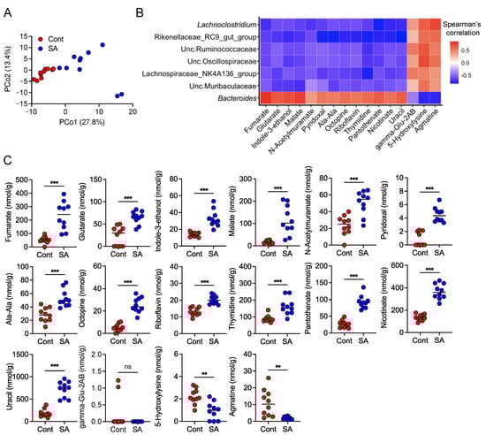 Dietary treatment with sodium alginate (SA) increased the levels of metabolites that correlated positively with the abundance of Bacteroides. Metabolites in mouse feces were analyzed by CE-TOFMS. Metabolome analyses were perFigure 4. weeks after feeding the mice HFD supplemented with or without 5% SA (n = 10 mice per group). (A) PCoA for the fecal samples was performed using unweighted UniFrac. (B) Heat map shows correlations between gut bacteria abundance and levels of fecal metabolites by Spearman’s correlation analysis. Red and blue colors denote the positive and negative correlation values, respectively. (C) Measurement of the levels of metabolites in the feces of mice maintained on a HFD supplemented with or without 5% SA. Each dot represents an individual mouse, and the horizontal bars indicate mean values. Statistical significance in (C) was assessed by unpaired Student’s t-test for glutarate, N-acetylmurate, pyridoxal, Ala-Ala, riboflavin, and 5-hydroxylysine; Welch’s t-test for fumarate, indole-3-ethanol, malate, octopine, uracil, and agmatine; and Mann–Whitney U-test for thymidine, pantothenate, nicotinate, and gamma-Glu-2AB. ** p < 0.01; *** p < 0.001; n.s., not significant. Cont: HFD diet, SA: HFD diet with 5% sodium alginate.