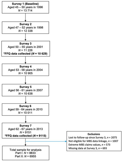 Flow chart of the participant selection using the 1946–1951 ALSWH cohort. Note: *FFQ, food frequency questionnaire; MBS, Medicare Benefits Schedule.
