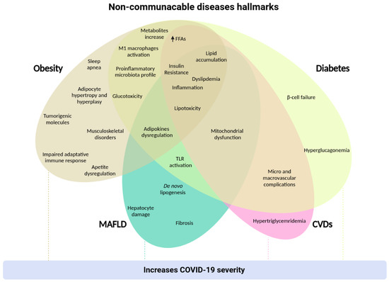 Non-communicable diseases (NCDs), also known as chronic diseases, are not directly transmissible from one person to another, and are the combination of genetic, physiological, environmental, and behavioral factors. The main NCDs are diabetes, cardiovascular diseases, cancers, and chronic respiratory diseases. The first three are associated with metabolic changes that increase the risk of suffering them. These changes are hypertension, overweight/obesity, hyperglycemia, and hyperlipidemia (WHO). The importance of these diseases was highlighted in the report of the World Health Organization (WHO) [1], in which it was reported that over 50% of the 57 million deaths worldwide, in 2016, occurred from diabetes (1.6 million people), cancer (9 million), and cardiovascular diseases (17.9 million) [2], posing a significant global health challenge. As well as genetics, unhealthy habits such as smoking, harmful use of alcohol, physical inactivity, and a calorie-rich diet are determinants for developing metabolism-related diseases; such behavioral factors lead to metabolic disorders such as hypertension, hyperglycemia, hyperlipidemia, and obesity, which comprise the major NCDs risk factors [3]. Furthermore, over the past two decades, the understanding of the association between metabolic disorders and metabolic associated fatty liver disease (MAFLD)—a less commonly discussed NCD—has placed it as an emerging risk factor for diabetes, cancer, and cardiovascular diseases (CVDs) [4].