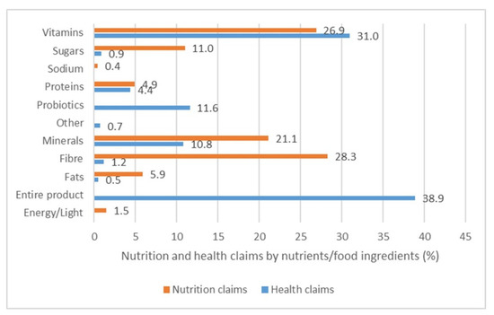 On the other hand, the majority of health claims (38.9%) referred to the entire product without specifying any nutrient or food ingredient (e.g., “healthy”, “good for you”, “fit”). Such health claims were most often reported in bread and toast (90.5%), cheese (66.7%), breakfast cereals (38.5%), milk (35.6%) and biscuits (35.3%). One-third of health claims referred to vitamins (31%), especially to vitamin B complex (e.g., “B vitamins contribute to maintaining normal energy metabolism”, “B vitamins contribute to reducing fatigue and exhaustion”, “vitamin B1 contributes to normal heart rate”). Overall, 1 in 10 health claims suggested the health-related function of minerals (nine different minerals and unspecified minerals) (10.8%), and of probiotics (11.6%) (Figure 1).