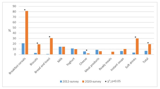 The proportion of pre-packaged food products containing nutrition claims in the 2012 survey [15] and the 2020 survey by product category. % is calculated over the total of products within each food group; * marks statistically significant difference between proportions in the 2012 survey and the 2020 survey, Chi-square test, p < 0.05.