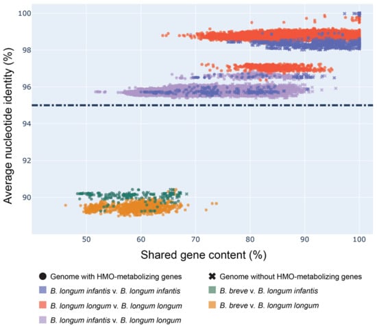 B. infantis genomes cluster separately from B.longum. Scatter plot of percent shared gene content versus ANI values across pairwise comparisons of Bifidobacterium genomes. Shared gene content calculated from BLAST and ANI values calculated by the Python package pyani. Presence of HMO-metabolizing genes determined by the occurrence of at least 60 of 79 (75%) genes in a genome. Dashed line indicates the ANI cutoff score of 95% for genomes belonging to the same species.