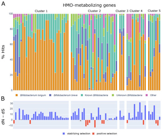 (A) Stacked bar plot showing taxonomic assignment of BLASTP hits (NCBI non-redundant database) for each HMO metabolizing gene. Known Bifidobacterium include any specified species in the Bifidobacterium genus other than B. longum or B. breve. Unknown Bifidobacterium include any unspecified Bifidobacterium taxa (Bifidobacterium, Bifidobacterium spp.). (B) Statistics from dN–dS analysis showing the probability and certainty that a given gene within the HMO-metabolizing gene clusters are under stabilizing or positive selection. Colored bars indicate statistical significance (). Analyses were conducted using the Nei-Gojobori method in MEGA X. All ambiguous positions were removed for each sequence pair (pairwise deletion option).