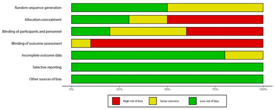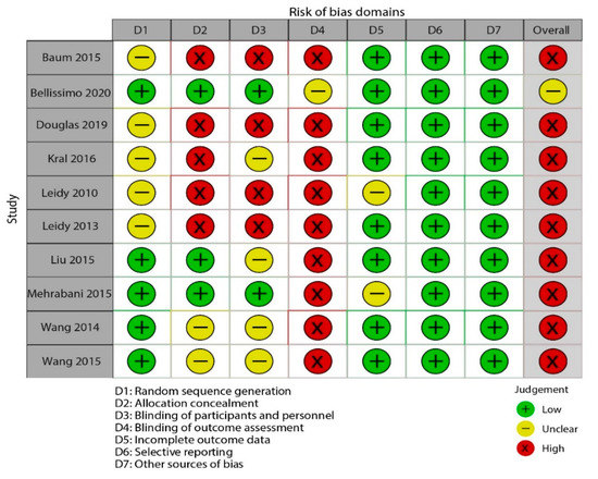 The risk of bias assessments for all included studies was presented in Table 4, Figure 2 and Figure 3. Due to lack of allocation concealment, blinding of participants and personnel, and blinding of subjective and objective outcome assessment, the primary issues were at a high risk of bias among the ten RCTs. Most RCTs reported information regarding randomization sequence generation was at unclear risk. Of ten included studies, nine were categorized as high risk, and one as unclear risk.