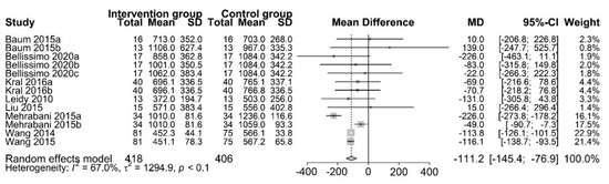 The effect of PR breakfast on SEI was examined in eight studies [13,14,15,16,17,20,23,24]. At the end of the trials (range 9 days to 3 months), we observed that participants who were assigned to consume PR breakfast had a lower SEI than those assigned to consume NP/traditional breakfast (MD, −111.2 kcal; 95% CI: −145.4 to −76.9; p < 0.01) (Figure 4), namely, consuming PR breakfast elicits the decrease of SEI. However, we did detect considerable inconsistency across trial results (Tau2 = 1294.9, I2 = 67.0%, Q = 36.3). The funnel plot showed some asymmetry (Figure A1). After the elimination of one trial, the results were largely robust to the traditional sensitivity analysis. The heterogeneity was significantly reduced (MD, −100.0 kcal; 95% CI: −120.5 to −79.5; Tau2 = 213.6, I2 = 24.0%, Q = 14.5). In addition, we performed a subgroup analysis based on study design, sex, economic status of country, and baseline body mass index (Table 5). Thus, we presumed that the trial of Mehrabani et al. [23] was the source of heterogeneity.