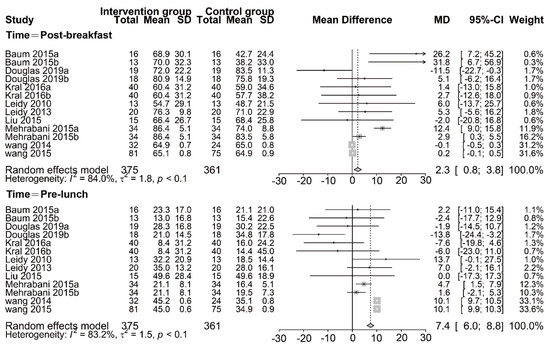 Fullness was reported according to the effect of PR breakfast in nine studies, including two time points of post–breakfast and pre–lunch [13,14,15,16,17,21,22,23,24].We found that participants who were assigned to consume PR breakfast had a higher fullness than those assigned to consume NP/traditional breakfast, in random–effects meta–analysis of the post–breakfast (MD, 2.3 mm; 95% CI:0.8, 3.8; p < 0.01) and pre–lunch group (MD, 7.4 mm; 95% CI: 6.0, 8.8; p < 0.01) (Figure 5), although there was substantial inconsistency across trial results (Tau2 = 1.8, I2 = 84.0%, Q = 74.7 and Tau2 = 1.5, I2 = 83.2%, Q = 71.4, respectively). The meta–analysis results for the pooled effects of the post–breakfast and pre–lunch groups were robust in the sensitivity analysis. Similarly, we also conducted a subgroup analysis (Table 6). To assess the impact of study design, we exclude the crossover design of the trial and found a large change in the mean difference (post–breakfast: 5.8 mm, 95% CI: 3.9, 7.7; pre–lunch: 2.39 mm, 95% CI: 0.3, 4.5). However, we found that it did not have a significant impact on the heterogeneity of the post-breakfast and pre–lunch group.