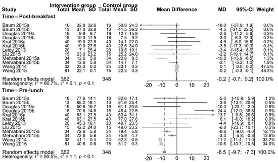 The effect of PR breakfast on hunger was examined in eight studies [13,14,15,17,21,22,23,24]. A random–effects meta–analysis revealed that the hunger did not differ between trials in the post–breakfast group (MD, −0.2 mm; 95% CI: −0.7, 0.2; p < 0.01) (Figure 6). However, we found that participants who were assigned to consume PR breakfast had a lower hunger than those assigned to consume NP/traditional breakfast in the pre–lunch group (MD, −8.48 mm; 95% CI: −9.7, −7.3; p < 0.01) (Figure 6), although there was significant inconsistency across trial results (Tau2 = 1.1, I2 = 90.5%, Q = 116.0). The meta–analysis result of the pre–lunch group was steady in the sensitivity analysis. Likewise, the results of all other subgroup analyses were not significant (Table 7).