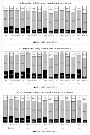 Frailty states by sex (A) and ethnicity: Māori (B) non-Māori (C) for all five waves.