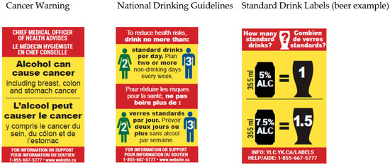 - Hobin, E.; Shokar, S.; Vallance, K.; Hammond, D.; McGavock, J.; Greenfield, T.K.; Schoueri-Mychasiw, N.; Paradis, C.; Stockwell, T. Communicating risks to drinkers: Testing alcohol labels with a cancer warning and national drinking guidelines in Canada. Can. J. Public Health 2020, 111, 716–725. [Google Scholar] [CrossRef] [PubMed]