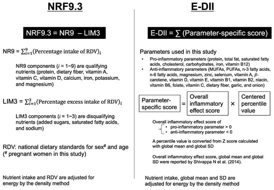 Both food-based and nutrient-based dietary indices are useful in assessing the overall quality and/or properties of a pregnant woman’s diet. However, the international use of food-based indices will require harmonization of the food database because foods frequently consumed are unique to each country’s dietary culture. In contrast, nutrients are universal so that nutrient-based dietary indices are globally used without further processing. Therefore, in this study, we used two dietary indices that are commonly used in the world, which cover a wide range of nutrients: the Nutrient-Rich Food Index 9.3 (NRF9.3) and the energy-adjusted dietary inflammatory index (E-DII) (Figure 1).