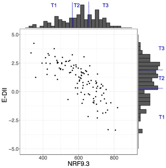 The mean (SD) NRF9.3 score was 602 (106), and the range was from 333 to 807. The mean (SD) E-DII score was 1.00 (1.55), which ranged from −3.36 to 4.23. The distributions of the NRF9.3 and E-DII scores are shown in Figure 2. According to each dietary index score, the participants were stratified by tertiles. The NRF9.3 scores across the tertiles were 333 ≤ T1 ≤ 565; 570 ≤ T2 ≤ 655; 655 < T3 ≤ 807. The E-DII scores across the tertiles were −3.36 ≤ T1 ≤ 0.33; 0.39 ≤ T2 ≤ 1.86; 1.93 ≤ T3 ≤ 4.23. There was a strong inverse correlation between the NRF9.3 total scores and the E-DII total scores (r = −0.793, p < 2.2 × 10−6).