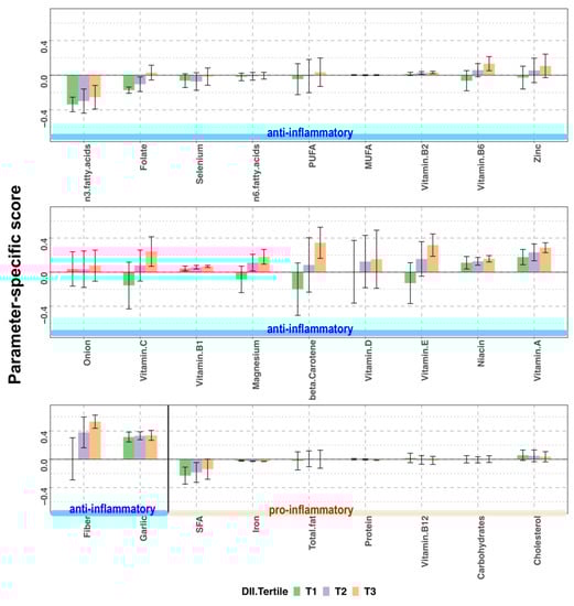 Parameter-specific scores according to the tertiles (T) of energy-adjusted dietary inflammatory index (E-DII) score in pregnant women of a birth cohort, BC-GENIST, in Japan. Bars represent the mean and error bars represent standard deviation (SD). The anti-inflammatory and pro-inflammatory parameters constituting the E-DII score are shown from left to right, from the lowest to the highest mean score of the entire cohort. Since the overall inflammatory effect scores of anti-inflammatory parameters are negative, lower intake of anti-inflammatory nutrients compared to the global mean result in a positive parameter-specific score. In contrast, as the overall inflammatory effect scores of pro-inflammatory parameters are positive, higher intake of pro-inflammatory nutrients result in a positive parameter-specific score. Higher E-DII scores indicate higher inflammatory potential. SFA, saturated fatty acids; MUFA, monounsaturated fatty acids; PUFA, polyunsaturated fatty acids; n = 36 (T1), 36 (T2), and 36 (T3).