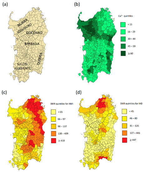 (a) subregions of Sardinia; (b) Ca2+ concentration in spring waters; (c) standardized mortality ratio (SMR) for acute myocardial infarction (AMI); (d) standardized mortality ratio for ischemic heart disease (IHD).
