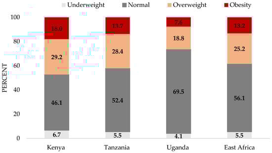 The BMI in East Africa among rural women was 24.5 kg/m2—almost at the threshold of overweight. In Kenya, the average BMI was within the overweight classification. Country comparison showed significant differences between Kenya and Uganda, and Tanzania and Uganda (Table 2). In Kenya and Tanzania, the rates of overweight and obesity were almost twice as much as Uganda. Overall, around 25% and 13% of the rural women were overweight and obese, respectively, in East Africa (Figure 1).