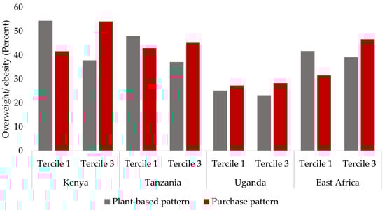 Table 7 highlights the association between the patterns and overweight and obesity. In Kenya, there was a significant positive association between women in tercile 3 of purchase pattern II (bread and snacks and rice) and overweight and obesity (OR 1.52; CI 0.99, 2.32) relative to those in tercile 1. More than half (54%) of the overweight and obese women were within the highest segment (tercile 3) of purchase pattern II (refer to Figure 2). There was no significant association between the other patterns and overweight and obesity (Table 7). The same table shows that none of the patterns were significantly associated with overweight and obesity except for the plant-based pattern in Tanzania. Women within the highest tercile, following the plant-based pattern, compared to those at the lowest tercile of this pattern, were about 41% less probable of being overweight and obese (OR 0.59; CI 0.35, 0.98). Hence, the percentage of overweight and obese women within the highest tercile of this pattern was lower, as shown in Figure 2. None of the patterns were significantly associated with overweight and obesity in Uganda. For East Africa as a whole, only two patterns—the plant-based and purchase patterns—were significantly associated with overweight and obesity. The plant-based pattern was negatively associated with overweight and obesity (OR 0.59; CI 0.41, 0.85). On the other hand, the purchase pattern, characterized by highly processed foods—bread and snacks and tea—was positively associated with overweight and obesity. Women in the highest tercile were 22% more probable of being overweight and obese than women in the lowest tercile (OR 1.22; CI 0.89, 1.66). Overall, about almost half (46%) of the overweight and obese women were found in the highest tercile of the purchase pattern (Figure 2).