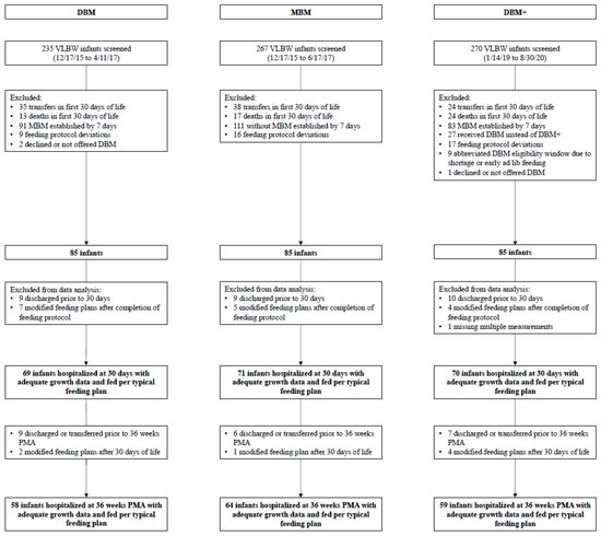 The DBM cohort consisted of 85 eligible VLBW infants (born weighing less than or equal to 1500 g) admitted to the NICU from December 2015 to April 2017 who received more than 1 week of DBM as previously described [3]. We identified a same size cohort of infants over a similar timeframe (December 2015 to June 2017) who had MBM well-established by 7 days, with less than or equal to 1 week of DBM use (MBM cohort). We then identified a third size-matched cohort consisting of eligible infants admitted to the NICU between January 2019 and August 2020, reflecting the period after DBM+ was implemented (DBM+ cohort). In the DBM+ era, those who received DBM instead of DBM+ were excluded. For all groups, infants were excluded if they transferred to another hospital or passed away in the first 30 days of life, did not follow the standardized feeding protocol (see below), did not receive any donor milk due to parent refusal or clinical discretion, or had an abbreviated donor milk eligibility window due to donor milk shortage or early ad lib feeding (i.e., not due to growth concerns).