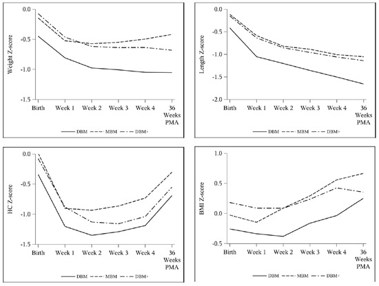 Weekly mean Fenton z-score for weight, length, and HC and Olsen z-score for BMI by cohort: DBM (n = 58), MBM (n = 64), DBM+ (n = 59).