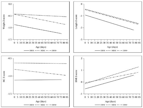 Length z-score decreased by 0.94–1.00 without any intergroup difference (Table 5). In the multivariable models adjusting for SGA (Table 8), length velocity was higher with DBM+ compared to DBM in week 1 (DBM reference 0.59 cm/week, DBM+ estimate difference 0.31 cm/week, 95% CI 0.04 to 0.58) and on average (DBM reference 0.88 cm/week, DBM+ estimate difference 0.082 cm/week, 95% CI −0.0085 to 0.17). Accordingly, the change in BMI z-score was greater with MBM and DBM compared to DBM+ in both the ANOVA and longitudinal models (Table 5, Table 7, and Table 9). Additionally, the change in length z-score over time was not different between groups, though there was a slight difference between the change in HC z-score over time between DBM and DBM+ cohorts (DBM+ estimate difference −0.0046 change in z-score per day, 95% CI −0.0093 to 0.0001) (Table 9, Figure 3 and Figure 4).