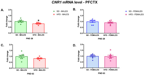Changes in the Cnr1 mRNA level in the PFCTX of adolescent (A) male and (B) female offspring or young adult (C) male and (D) female offspring whose mothers were fed on an SD or HFD during pregnancy and lactation. HFD—high-fat diet; PFCTX—prefrontal cortex; PND—postnatal day; SD—standard diet. Data are presented as the mean ± SEM with individual value plots. N = 8 rats/group. * p < 0.05 vs. SD.