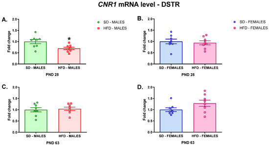 Changes in the Cnr1 mRNA level in the DSTR of adolescent (A) male and (B) female offspring or young adult (C) male and (D) female offspring whose mothers were fed on an SD or HFD during pregnancy and lactation. DSTR—dorsal striatum; HFD—high-fat diet; PND—postnatal day; SD—standard diet. Data are presented as the mean ± SEM with individual value plots. N = 8 rats/group. * p < 0.05 vs. SD.