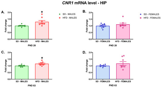 Changes in the Cnr1 mRNA level in the HIP of adolescent (A) male and (B) female offspring or young adult (C) male and (D) female offspring whose mothers were fed on an SD or HFD during pregnancy and lactation. HFD—high-fat diet; HIP—hippocampus; PND—postnatal day; SD—standard diet. Data are presented as the mean ± SEM with individual value plots. N = 8 rats/group. * p < 0.05 vs. SD.
