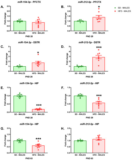 Increased levels of miR-154-3p (t = 2.803; df = 14; p = 0.0141) (Figure 4C) and miR-212-5p (t = 5.343; df = 14; p = 0.0001) expression (Figure 4D) were observed in the DSTR of male offspring following a maternal HFD.